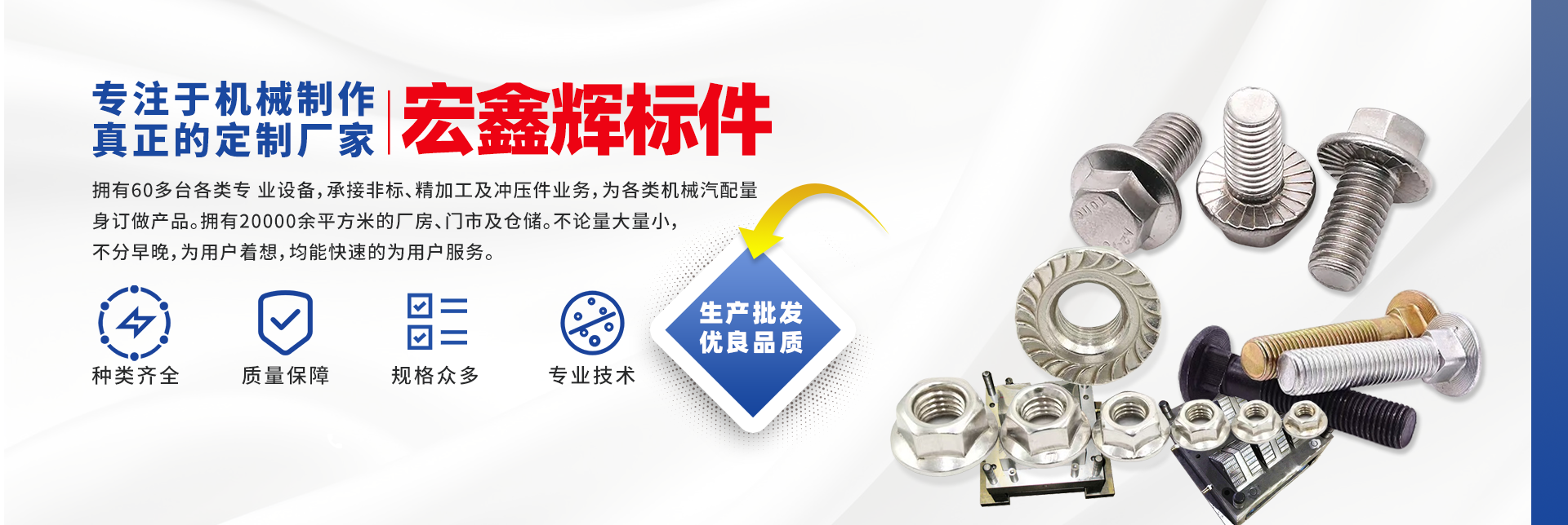 四川宏鑫輝標準件制造有限公司下設:南充市宏輝機械制造有限公司,南充市聚宏機電設備有限公司,公司始建于1994年。為了拓展市場,降低成本,本公司于2007年、2020年分別在南充、 成都、重慶創(chuàng)建了生產(chǎn)基地。擁有60多臺各類專 業(yè)設備,承接非標、精加工及沖壓件業(yè)務,為各 類機械汽配量身訂做產(chǎn)品。擁有20000余平方米的廠房、門市及倉儲。公司以誠信為本,竭誠為廣大客戶提供服務。不論量大量小,不分早晚,為用戶著想,均能快速的為用戶服務。 公司所生產(chǎn)及代理的產(chǎn)品為業(yè)界人士公認的國內(nèi)、國際優(yōu)等品牌。在產(chǎn)品性能與質量